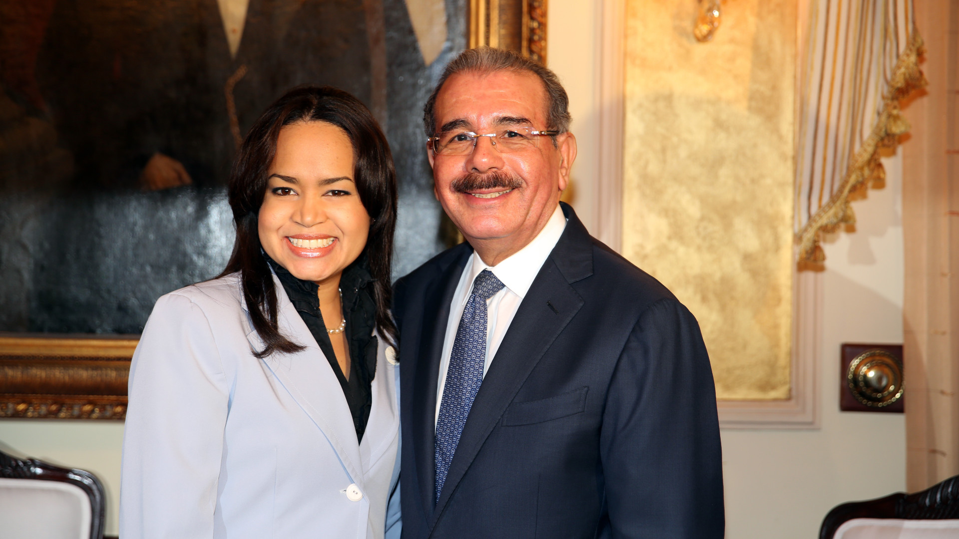 Presidente de la República, Danilo Medina Sánchez junto a Karina López, secretaria general de la Asociación Dominicana de Prensa Turística (ADOMPRETUR, presente en el encuentro.