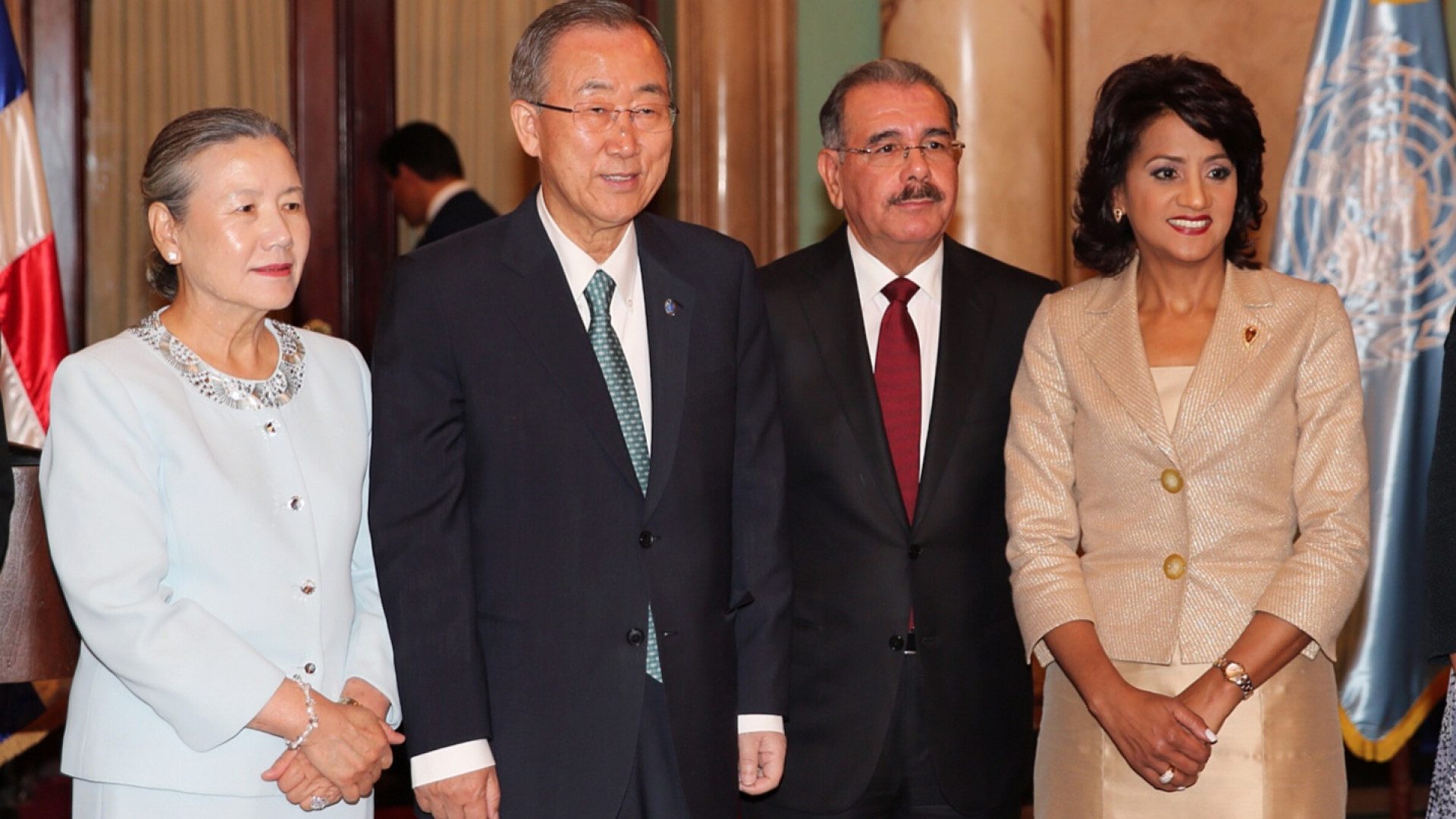 El presidente Danilo Medina y su esposa, Cándida Montilla de Medina junto al secretario general de la Organización de las Naciones Unidas (ONU), Ban Ki-moon y su esposa, Yoo Soon-Taek, durante el encuentro efectuado en el salón de Embajadores del Palacio Nacional.