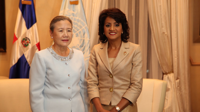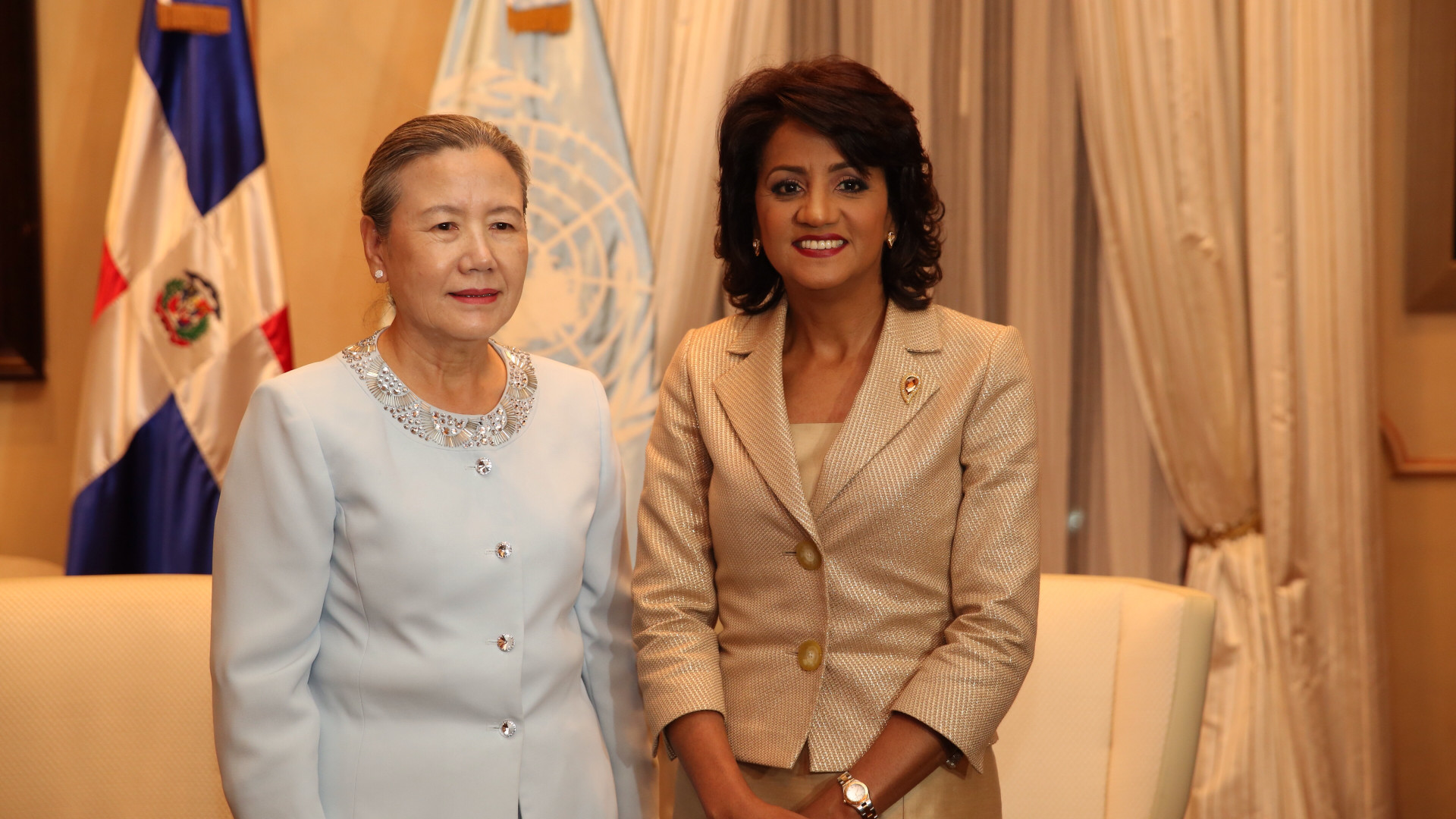 Señora Yoo Soon-Taek , esposa del Segretario General de la ONU y señora Cándida Montilla de Medina, esposa del Presidente de la República, Danilo Medina Sánchez, durante el encuentro en el Palacio Nacional.