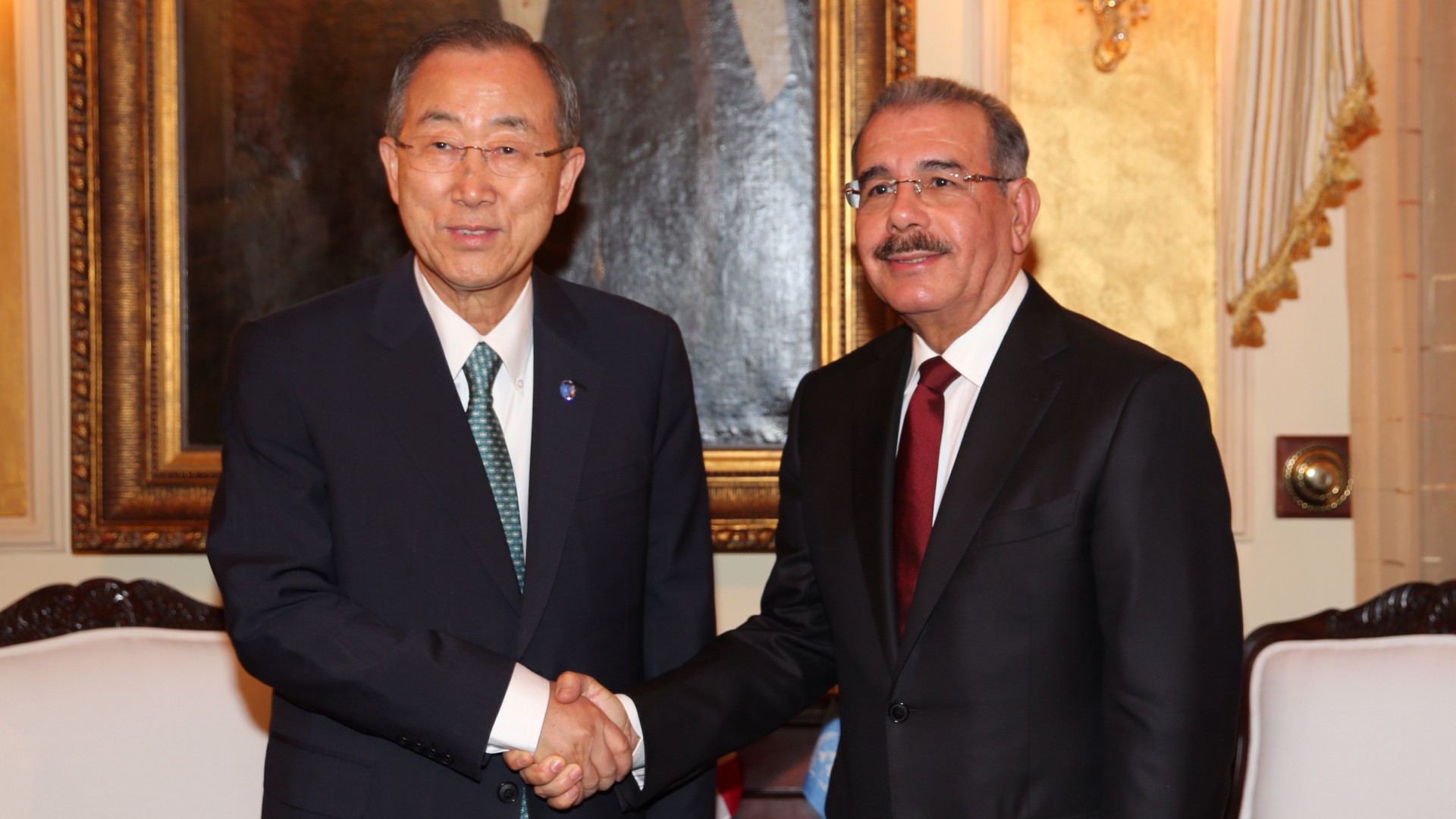 Presidente de la República, Danilo Medina Sánchez saluda al secretario general de la ONU, Ban Ki-moon, durante su visita al Palacio Nacional.