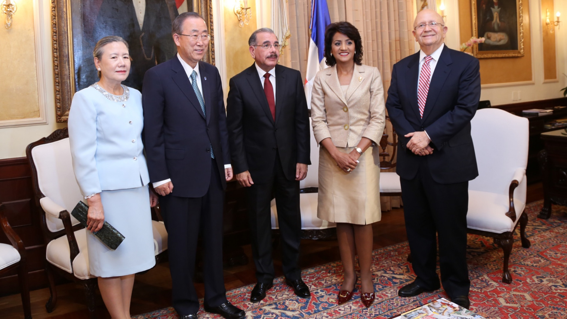 A la izquierda, señora Yoo Soon-Taek, seguida de su esposo Ban Ki-moon, secretario general de la ONU; presidente de la República, Danilo Medina Sánchez, junto a su esposa señora Cándida Montilla de Medina y el ministro de Relaciones Exteriores, Carlos Morales Troncoso. Foto: Presidencia República Dominicana new.livestream.com/PresidenciaRD/SecretarioONUyPresidente...