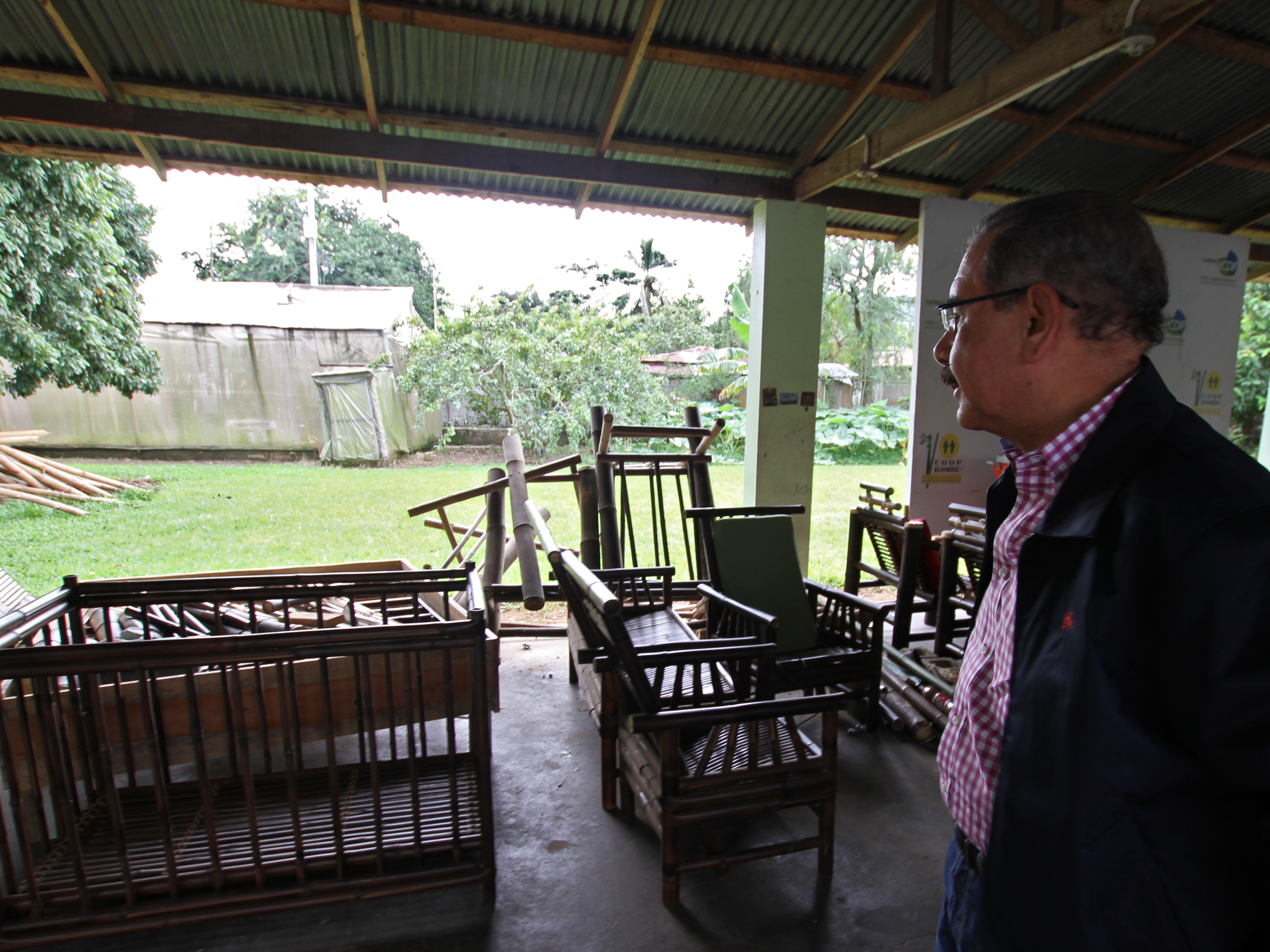 El presidente Danilo observó algunos muebles fabricados por jóvenes que estudian en la Cooperativa del Bambú (COOPBAMBÚ), a quienes anunció la ayuda oficial mediante financiamiento y asistencia técnica para que puedan continuar la producción de diversos artículos con este material y puedan adquirir maquinarias en Taiwán.
