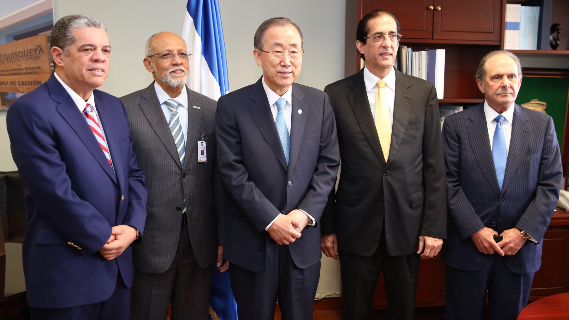 Desde la izquierda, Carlos Amarante Baret, ministro de Educación; Pedro Luis Castellanos, director general de la Dirección General de Programas Especiales (DIGEPEP); Ban Ki-moon, secretario general de la ONU; Gustavo Montalvo, ministro de la Presidencia de la República; y el viceministro de Relaciones Exteriores, José Manuel Trullos, presentes en el encuentro efectuado en la sede de la institución.