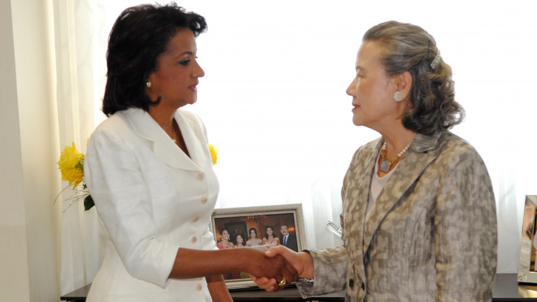 Señora Cándida Montilla de Medina, esposa del Presidente de la República, saluda a la señora Yoo Soon-Taek, esposa del secretario general de la Organización de las Naciones Unidas (ONU), a su llegada a las instalaciones del Centro de Atención Integral (CAID), en ocasión de la visita oficial al país.