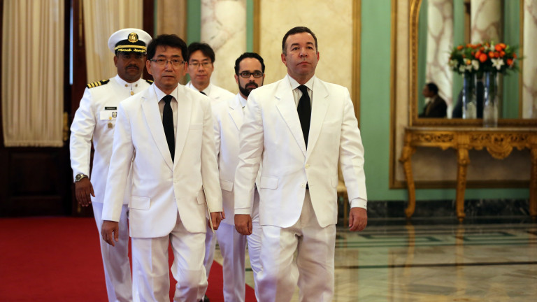 Señor Oh Han-Gu, embajador de la República de Corea, al momento de ser dirigido ante el Presidente de la República, donde presentará sus credenciales como nuevo embajador en el país. Le acompañan, los encargados de Ceremonial y Protocolo del Estado, embajador Pedro Gómez y de la Presidencia de la República, Jaime Rodríguez.