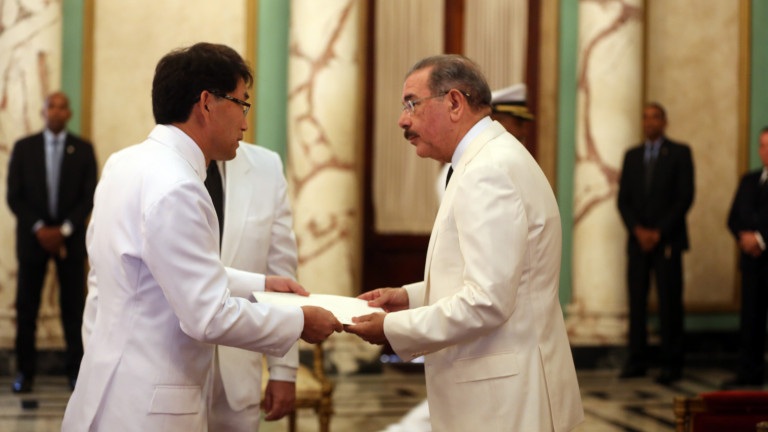 Presidente de la República, Danilo Medina Sánchez mientras recibe del señor Oh Han-Gu, embajador de la República de Corea, sus credenciales que le acreditan como nuevo embajador en el pais, durante acto protocolar efectuado hoy en el Salón de Embajadores del Palacio Nacional.