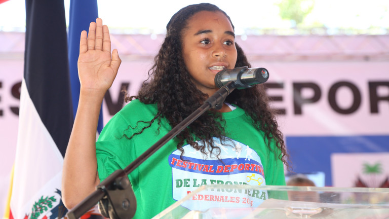 Eliangys Féliz, en representación de Pedernales, al momento de tomar el juramento a sus connacionales que participarán en la justa deportiva donde participan más de mil atletas de la zona y 231 procedentes de Ans-A-Pitre para competir en 16 disciplinas, incluyendo seis de playa.