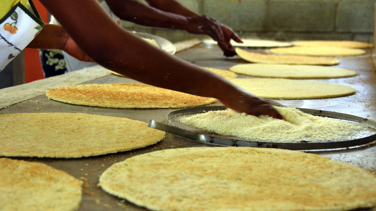 Vista del proceso de elaboración del casabe de productores agrupados en la Asociación de Casaberos La Santísima de La Ceiba, en Loma de Cabrera, provincia Dajabón, quienes recibieron el crédito solidario del Estado para aumentar su producción.
