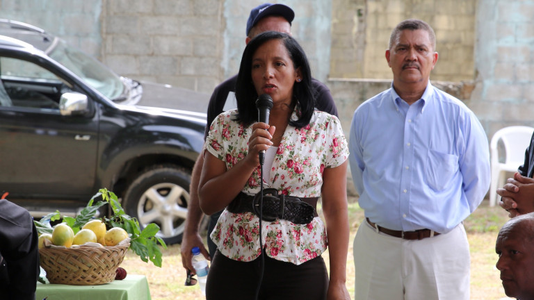 Rosa Gutiérrez, habló en representación de la Cooperativa La Estrella en el encuentro con el presidente Danilo Medina, durante su visita sorpresa a esta comunidad.
