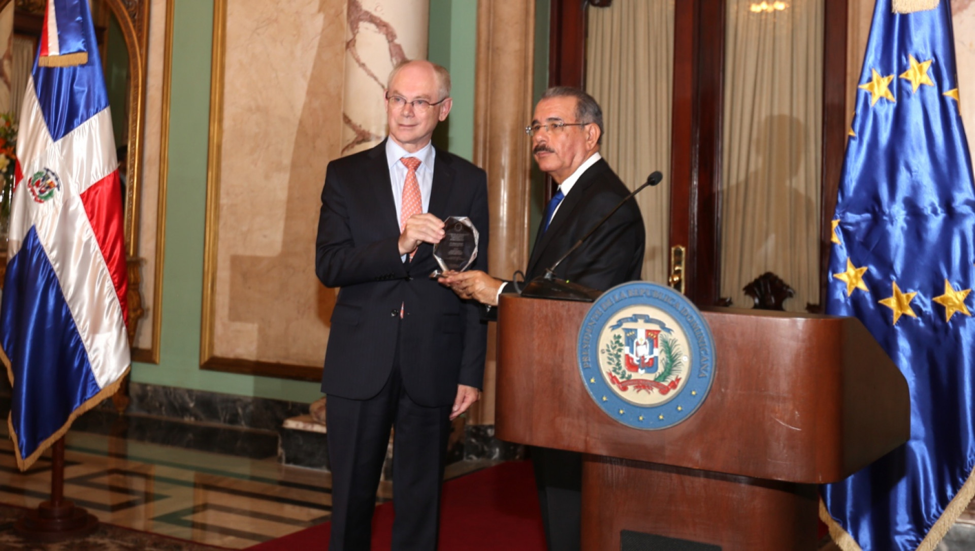 El presidente de la República, Danilo Medina Sánchez recibe del presidente del Consejo Europeo, Herman Van Rompuy, reconocimiento otorgado en ocasión de los 25 aniversario del ingreso de la República Dominicana a la Convención de Lomé IV, hecho que señaló “constituye una ocasión sin precedentes para resaltar estos datos y dar un nuevo impulso a nuestras relaciones”.