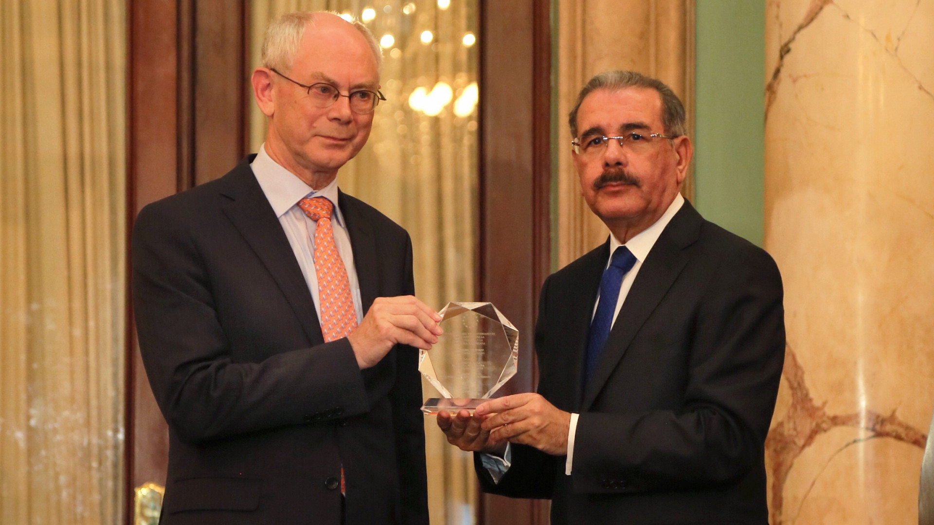 El presidente Medina recibe del presidente del Consejo Europeo, Herman Van Rompuy, la placa de reconocimiento en la que:"Felicita al presidente de la República Dominicana, Danilo Medina, por su excelente apoyo en el fortalecimiento de las relaciones bilaterales", entregada hoy durante visita oficial, en el Palacio Nacional.