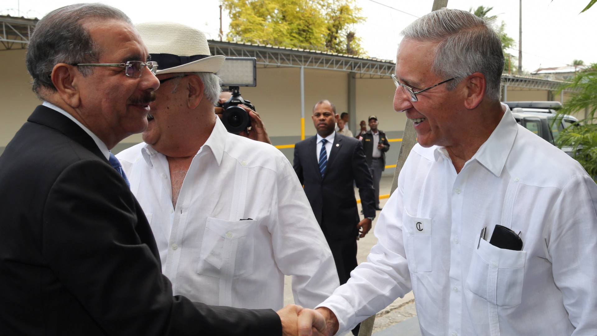 Presidente de la República, Danilo Medina Sánchez saluda los señores Norberto Armenteros, vicepresidente administrativo y Miguel Feris Iglesias, presidente ejecutivo del Grupo César Iglesias, S.A, durante su llegada a las instalaciones de la empresa.