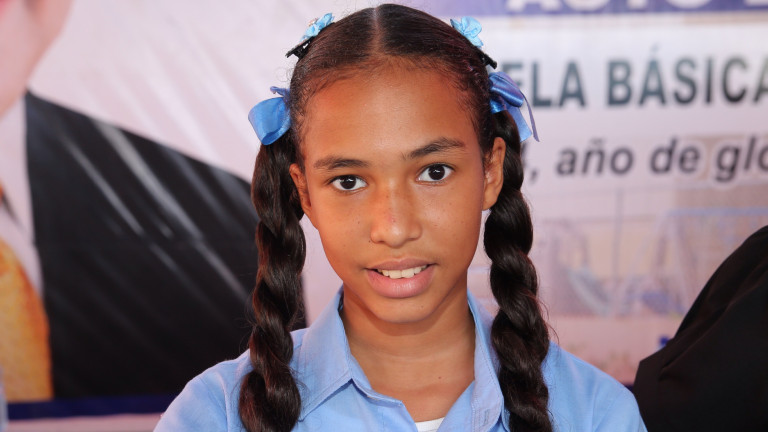 La estudiante Raisa Sánchez, quien expresó las gracias al presidente Medina por la entrega de los planteles escolares.