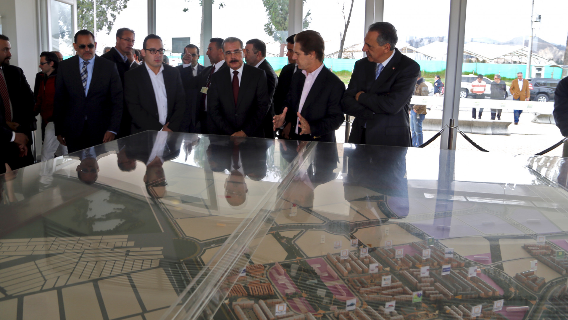 Presidente de la República Danilo Medina Sánchez y acompañantes reciben explicaciones de Roberto Moreno, presidente de Amarilo S.A., empresa que tiene a su cargo la gerencia integral del urbanismo del Macro Proyecto Ciudad Verde, donde están previstas aproximadamente 49.500 viviendas que equivalen a una población de 200.000 habitantes.
