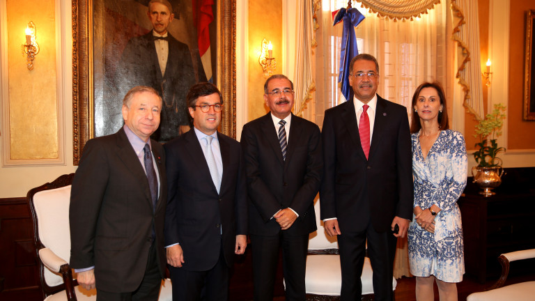 El presidente de la República, Danilo Medina Sánchez, recibió la visita de cortesía del presidente del Banco Interamericano de Desarrollo (BID), Luis Alberto Moreno, acompañado del presidente de la Federación Internacional de Automovilismo (FIA), Jean Todt y la representante del BID en el país, Flora Montealegre Painter. Figura además, el ministro de Hacienda, Simón Lizardo Mézquita.