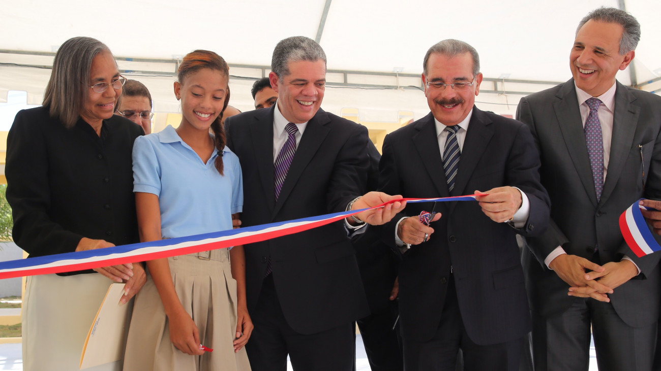 El Presidente Danilo Medina cortó la cinta para poner en servicio la Escuela Luisa Eneida Nolasco de Michel y luego se trasladó a la Escuela Básica Villa Guerrero, donde también hizo lo propio.