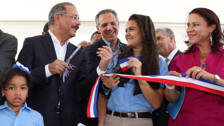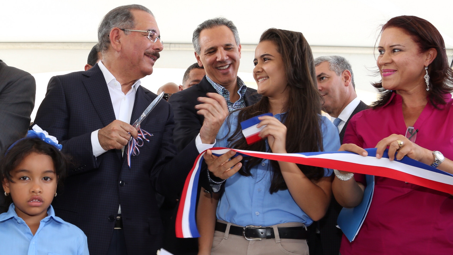 El presidente de la República Danilo Medina Sánchez corta la cinta para dejar inaugurado los centros educativos junto al ministro José Ramón Peralta; Gonzalo Castillo, ministro de Obras Públicas; estudiantes y directivos de las escuelas y Carlos Amarante Bared, ministro de Educación, entre otros.