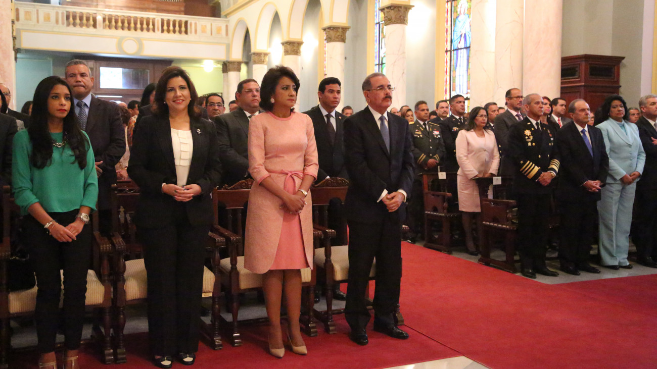 Señorita Candy Sibely Medina Montilla, vicepresidenta Margarita Cedeño de Fernández, primera dama Cándida Montilla de Medina y presidente Danilo Medina Sánchez durante la misa de acción de gracias celebrada con motivo del segundo año de gestión de gobierno, en la Capilla San Rafael Arcángel, ubicada en la Casa de Gobierno.
