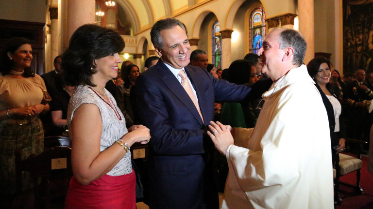 El ministro administrativo de la Presidencia, José Ramón Peralta y señora, saludan al capellán del templo, el padre Gerardo Ramírez, luego de la misa de acción de gracias.
