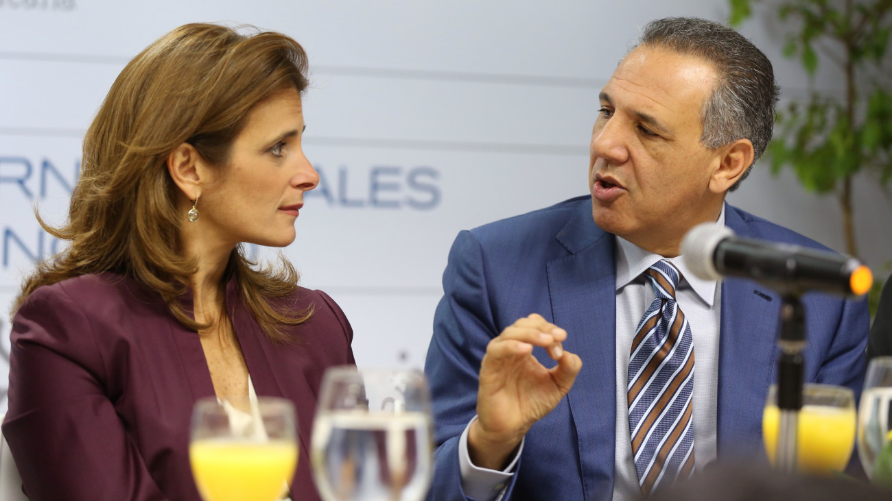Señora Ligia Bonetti, presidenta de la Asociación de Industrias de República Dominicana (AIRD) y ministro Administrativo de la Presidencia, José Ramón Peralta, durante el desayuno temático que organizó esa entidad.