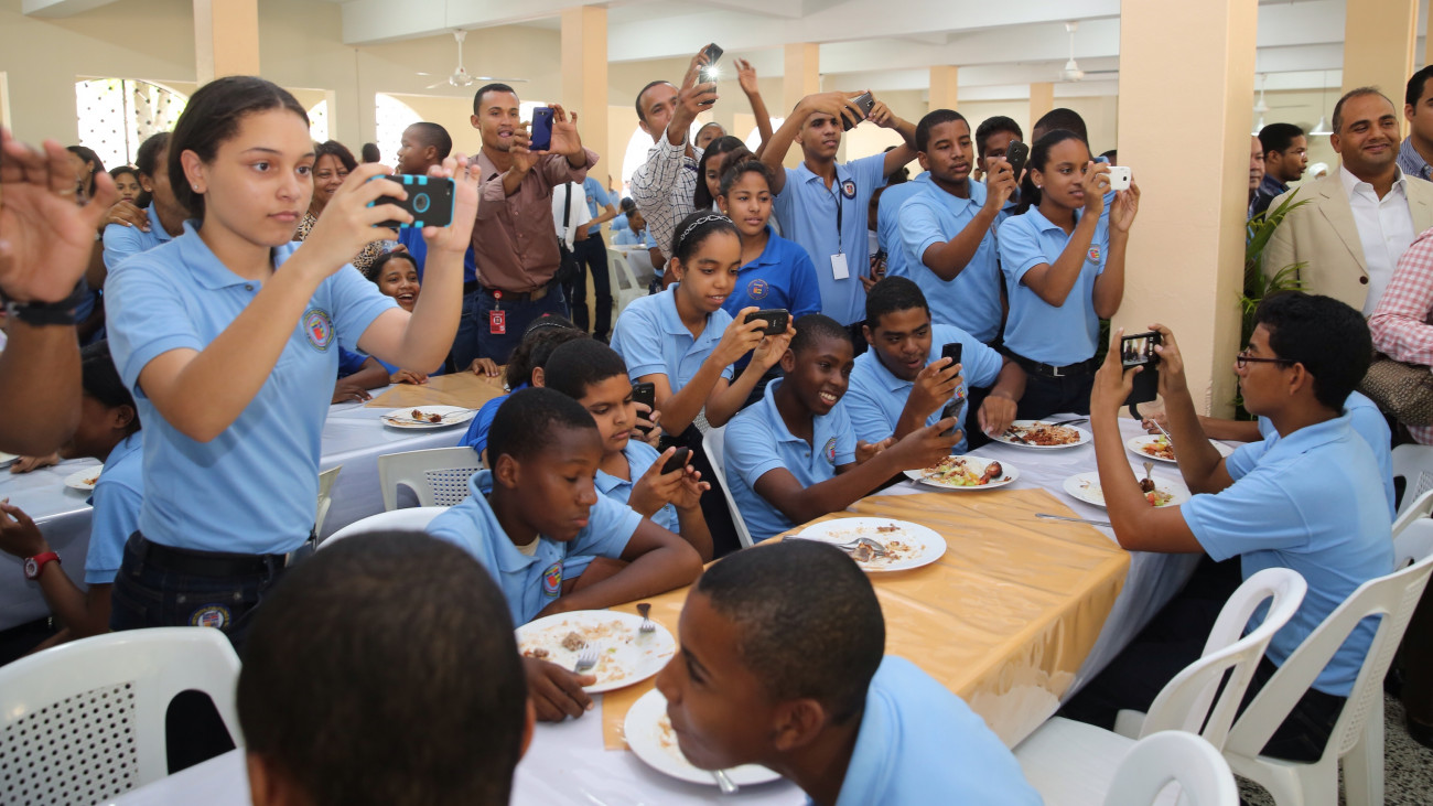 Estudiantes toman fotos del presidente Danilo Medina, como recuerdo de su visita.
