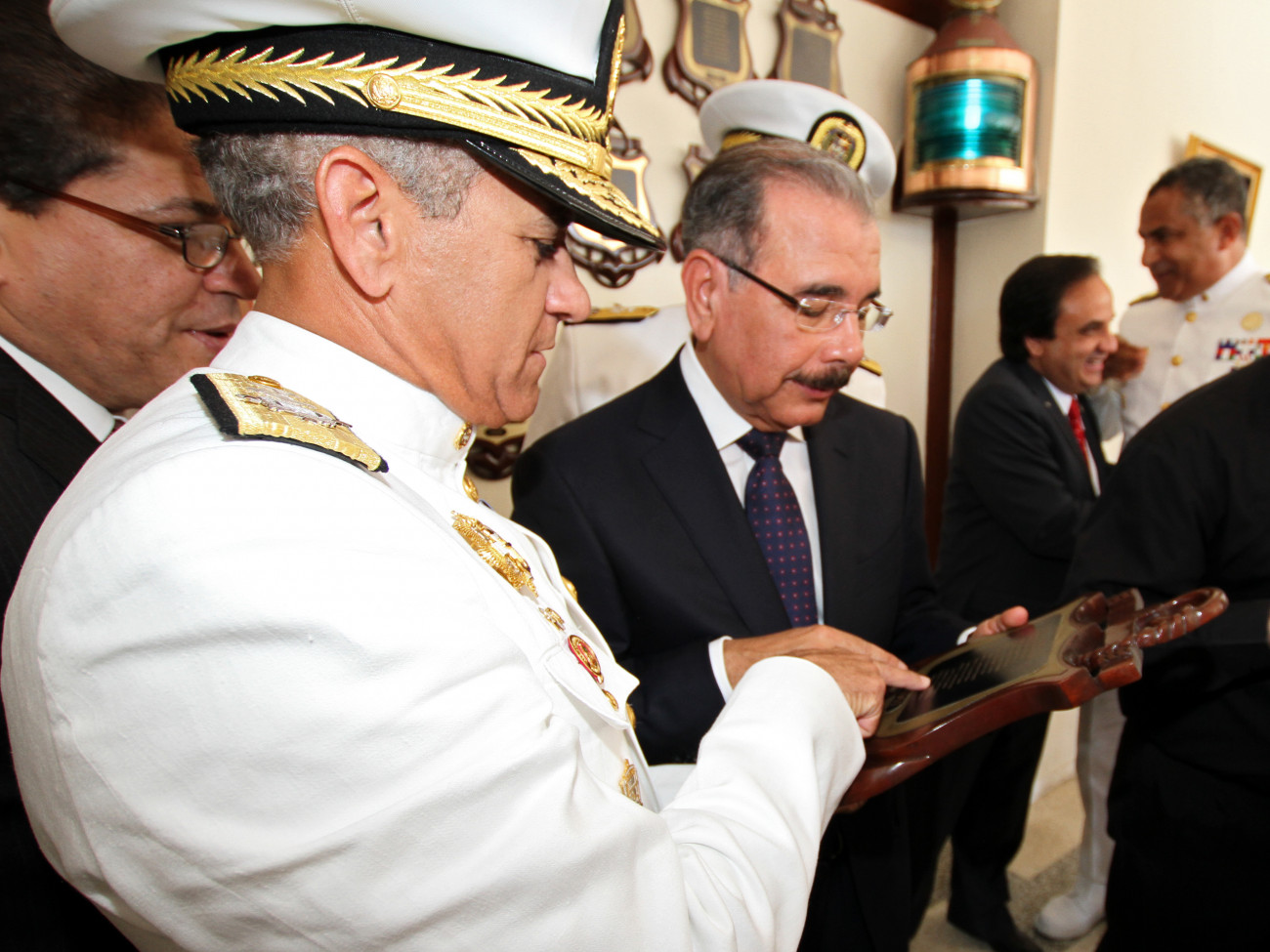El ministro de las Fuerzas Armadas, Sigfrido Pared Pérez, le muestra al presidente Medina una placa con los nombres de los graduados de la sexagésima primera promoción de Caballeros Guardamarinas de la Marina de Guerra de la República Dominicana.