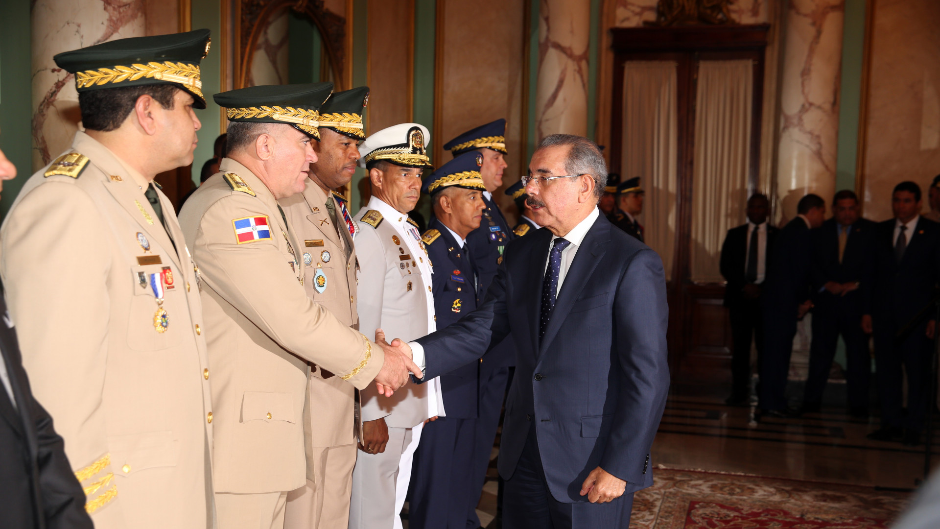 Presidente Danilo Medina saluda altos mandos militares presentes durante ceremonia de juramentación.