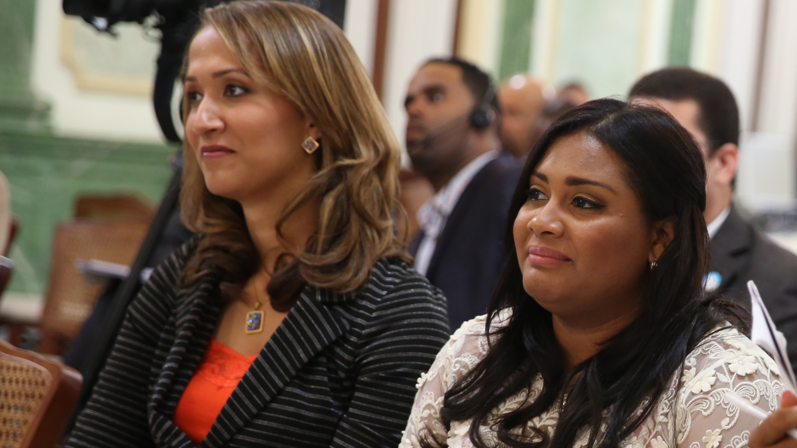 Periodistas presentes en el encuentro de funcionarios responsables de las acciones gubernamentales en las MIPyMES, efectuado en el Salón Verde del Palacio Nacional.