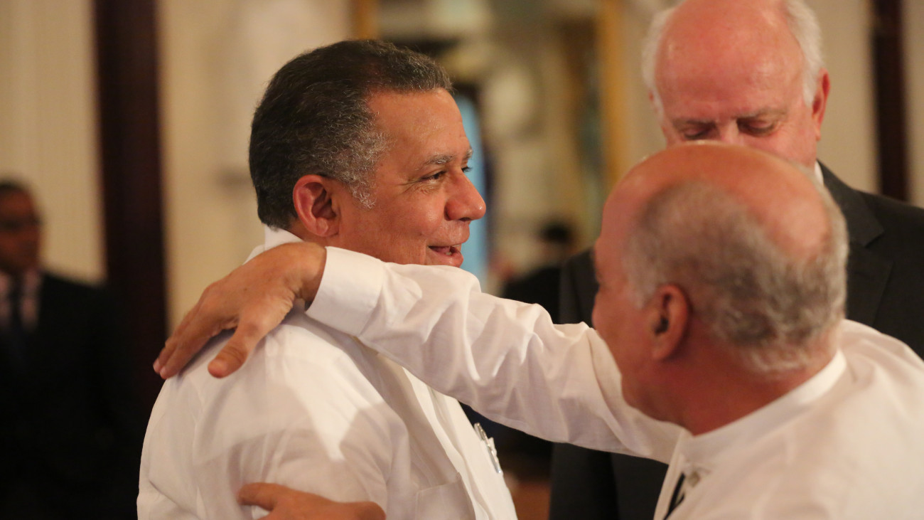 Juan Bolívar Díaz recibe felicitaciones de amigos y familiares presentes en a ceremonia de premiación.