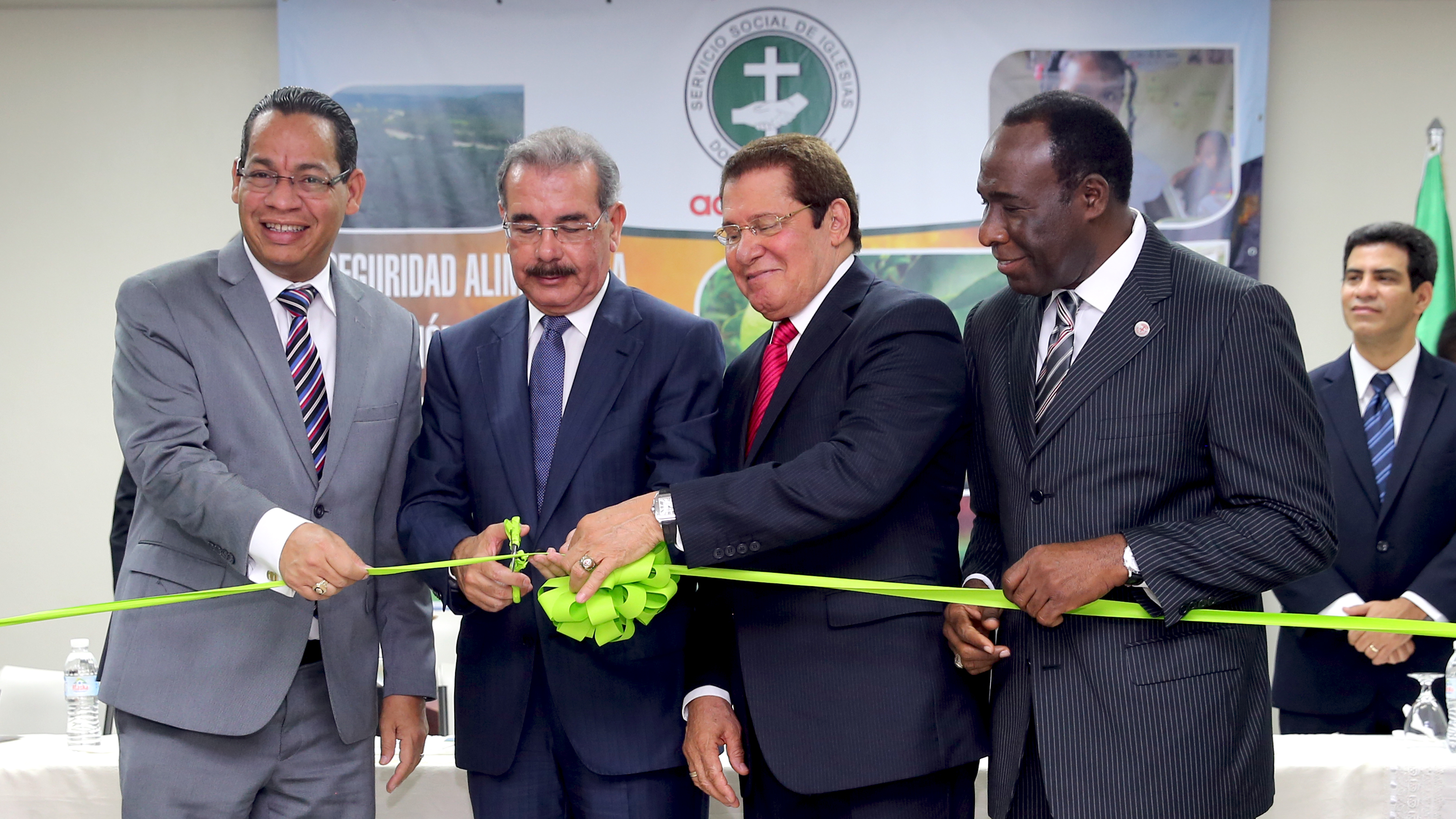 Obispo Elvis Samuel Medina; presidente de la República, Danilo Medina Sánchez; Rev. Manuel Estrella y Lorenzo Mota King, director ejecutivo del SSID, en la recepción inaugural de la obra.