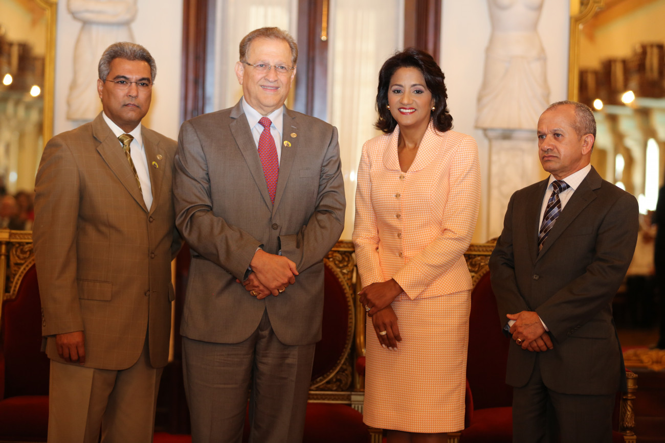 Señora Cándida Montilla de Medina, esposa del Presidente, junto al doctor Luis Alam Lora, pediatra más destacado del año 2014; el Ministro de Salud y el Presidente de la Asociación de Pediatría.
