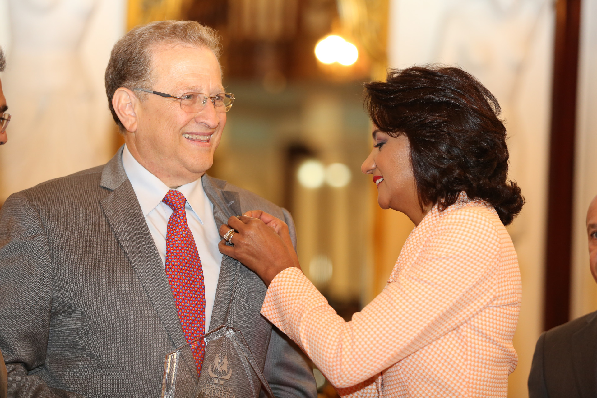 La Primera Dama coloca en solapa del doctor Luis Alam Lora, un pin de reconocimiento al mérito de su destacada labor profesional.