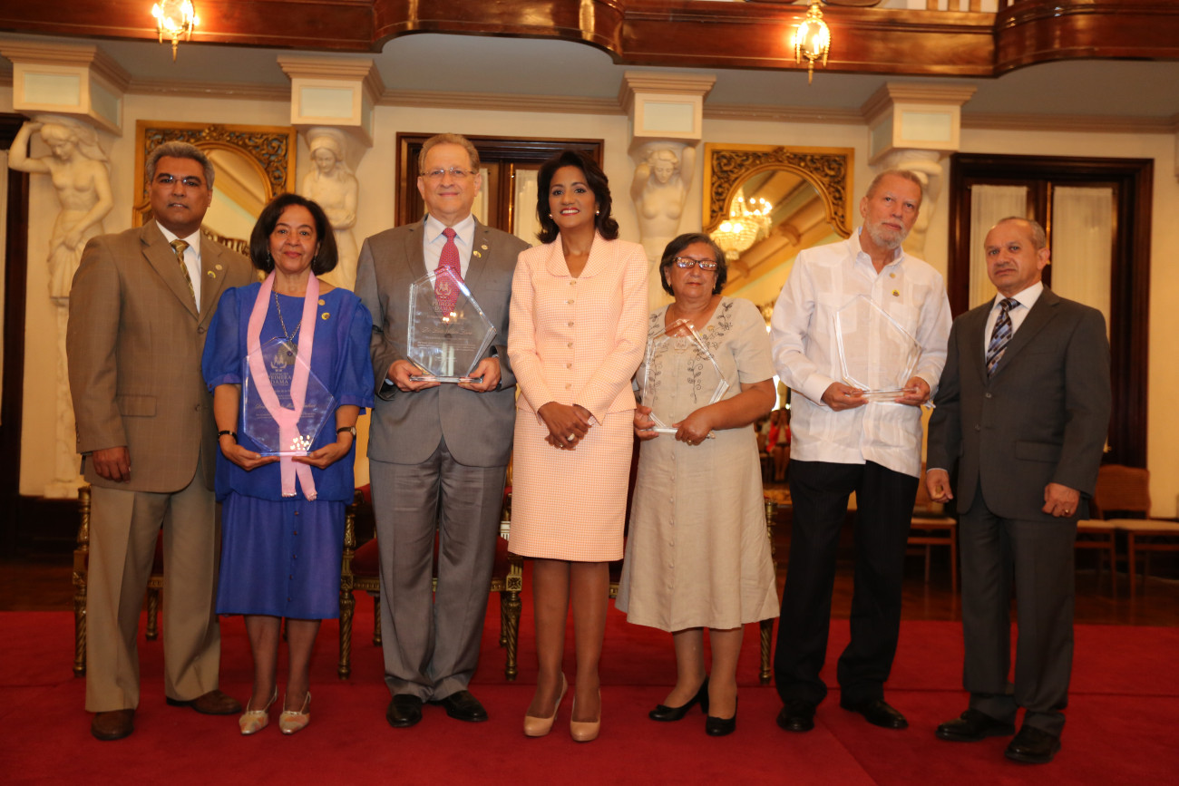Señora Cándida Montilla de Medina, doctor Luis Alam Lora, pediatra más destacado del año 2014; Rosario Pérez Féliz; Ángela Matos Imbert, y Rubén Darío Pimentel. Figuran además, el ministro Freddy Hidalgo y Rodolfo Soto Ravelo, entre otros.
