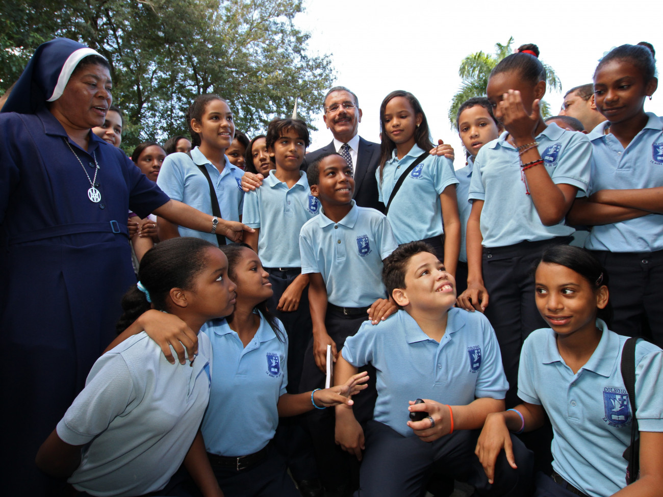 El presidente Danilo Medina junto a estudiantes y profesoras del Proyecto Escuela La Hora de Dios, del sector Buenos Aires de Herrera en Santo Domingo Oeste,durante su Visita sorpresa.