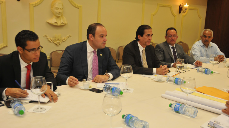 Reunión encabezada por los ministros, Gustavo Montalvo, Ángel Estévez y José del Castillo Saviñón, realizada en el Salón Hermanas Mirabal del Palacio Nacional.