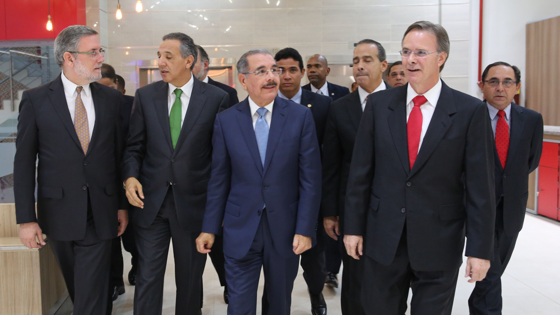 El presidente Danilo Medina recorre las instalaciones junto al ministro José Ramón Peralta, Roberto Rodríguez Marchena, director de DICOM; y Florencio García, presidente ejecutivo de la empresa.