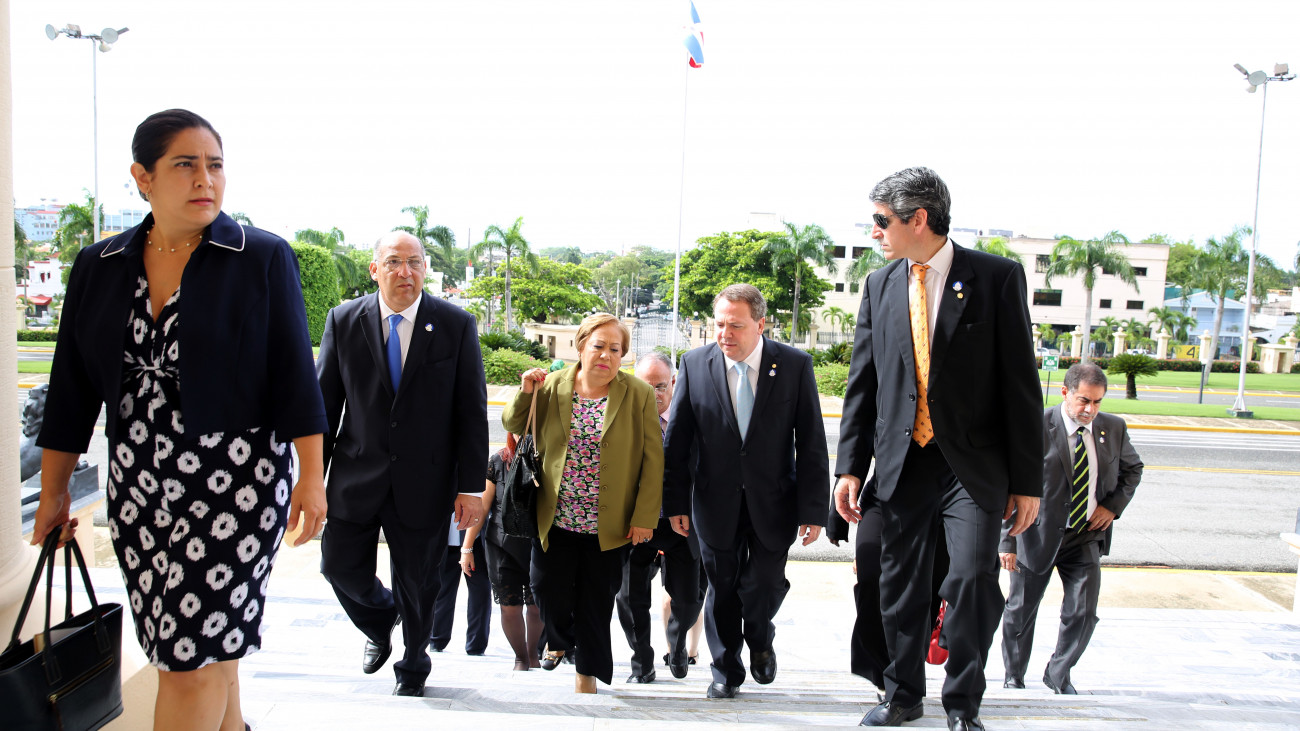 Llegada de los empresarios de Paraguay al Palacio Nacional. Le acompañan Luisa Fernández, directora del Consejo Nacional de Zonas Francas de Exportación, y Marino Berigüete, embajador dominicano en la República del Paraguay, entre otros.