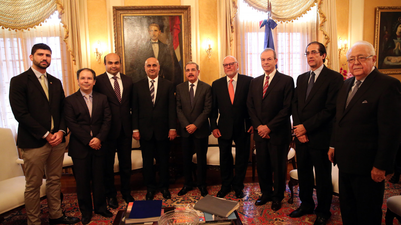 Presidente de la República, Danilo Medina Sánchez, junto a Mahmood Al Bastaki, experto en comercio electrónico; Ravi Kumar y principales ejecutivos del Consorcio empresarial Dubai Trade FZE; el ministro de la Presidencia, Gustavo Montalvo; y el ministro de Estado sin Cartera, Antonio Isa Conde.
