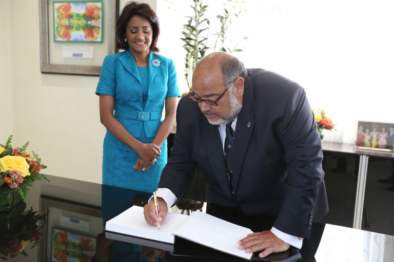 La primera dama Cándida Montilla de Medina observa a Miguel Palha al firmar el libro de visitantes distinguidos del CAID.
