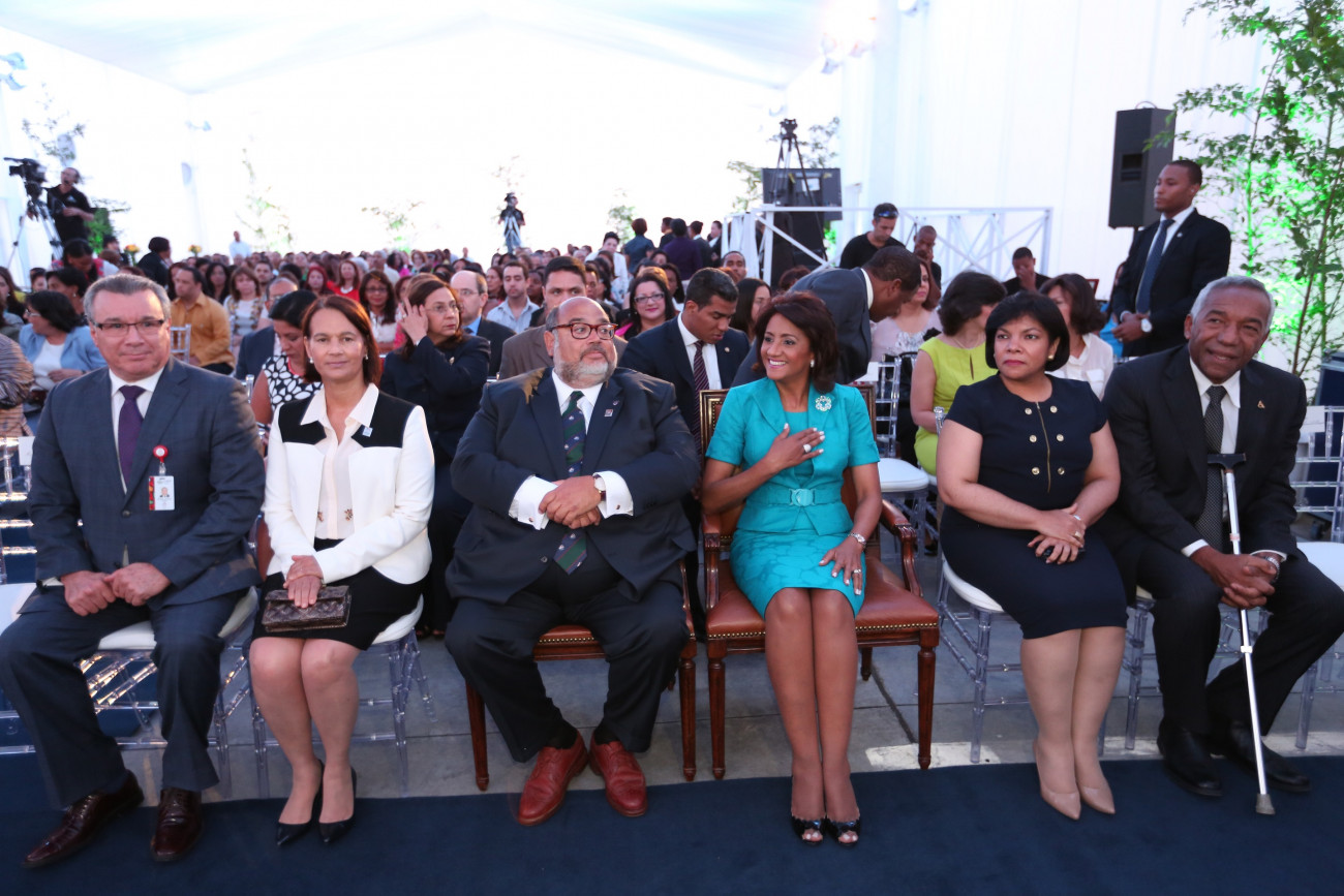 Al centro, Cándida Montilla de Medina, junto al director clínico del Centro de Desenvolvimiento Infantil Diferencias, de Lisboa, Portugal, Miguel Palha. Figuran además, el director del CAID, doctor Moisés Taveras y la licenciada Luz Marina Álvarez, coordinadora administrativa del Despacho y asistente de la Primera Dama, entre otros.