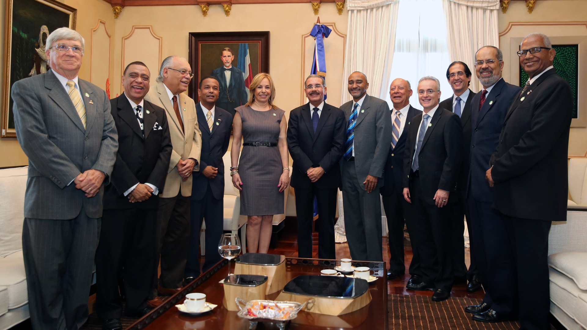 Presidente Danilo Medina Sánchez y comitiva del Consejo Directivo 2013-2015 de ADORA, integrada por su presidente, José Reyes Gómez, junto a Ramón Lluberes, Johannes Streese, Francisco Micheli, Calazán Omar Cepeda, José D. Ares Guzmán, Roberto Lama, Américo F. Martínez, Ivelisse García Miguel y José A. Lluberes. Acompañó al mandatario, el Ministro Gustavo Montalvo.