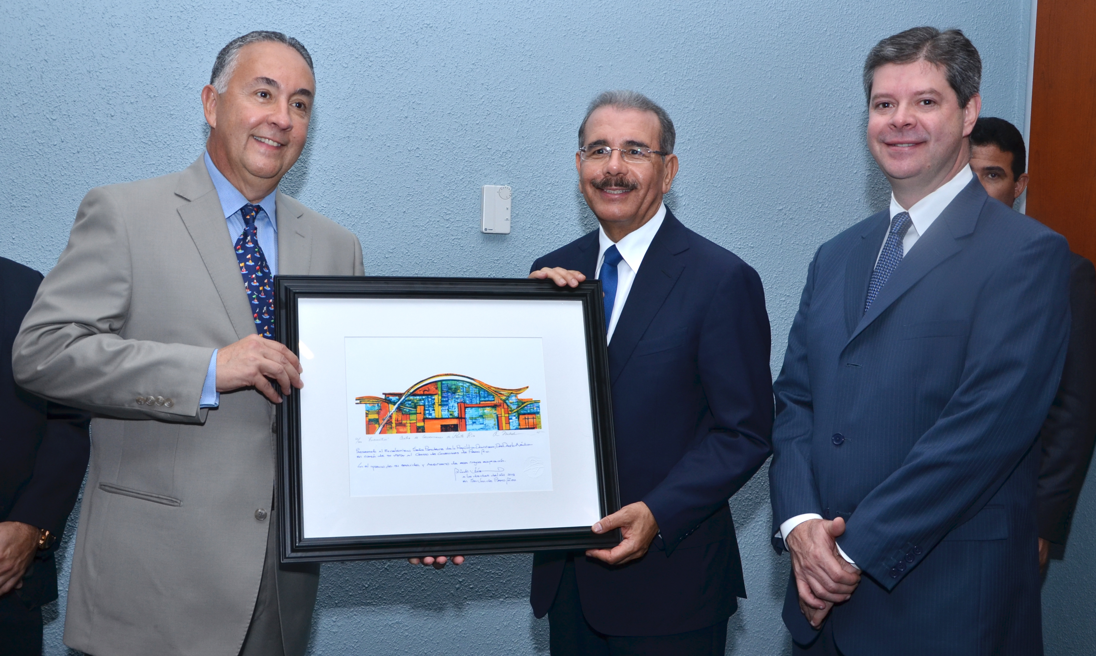 Al concluir el recorrido del Centro de Convenciones, el señor Pedro Jiménez, arquitecto del Centro, y el señor Rafael Cerame D'Acosta hicieron entrega de un regalo conmemorando al presidente Medina conmemorando su visita.