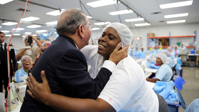 Presidente Danilo Medina junto a empleados de la empresa Fenwal International Inc, en Zona Franca de San Cristóbal durante recorrido previo a recepción inaugural. Foto: Luis Ruiz Tito/Presidencia República Dominicana