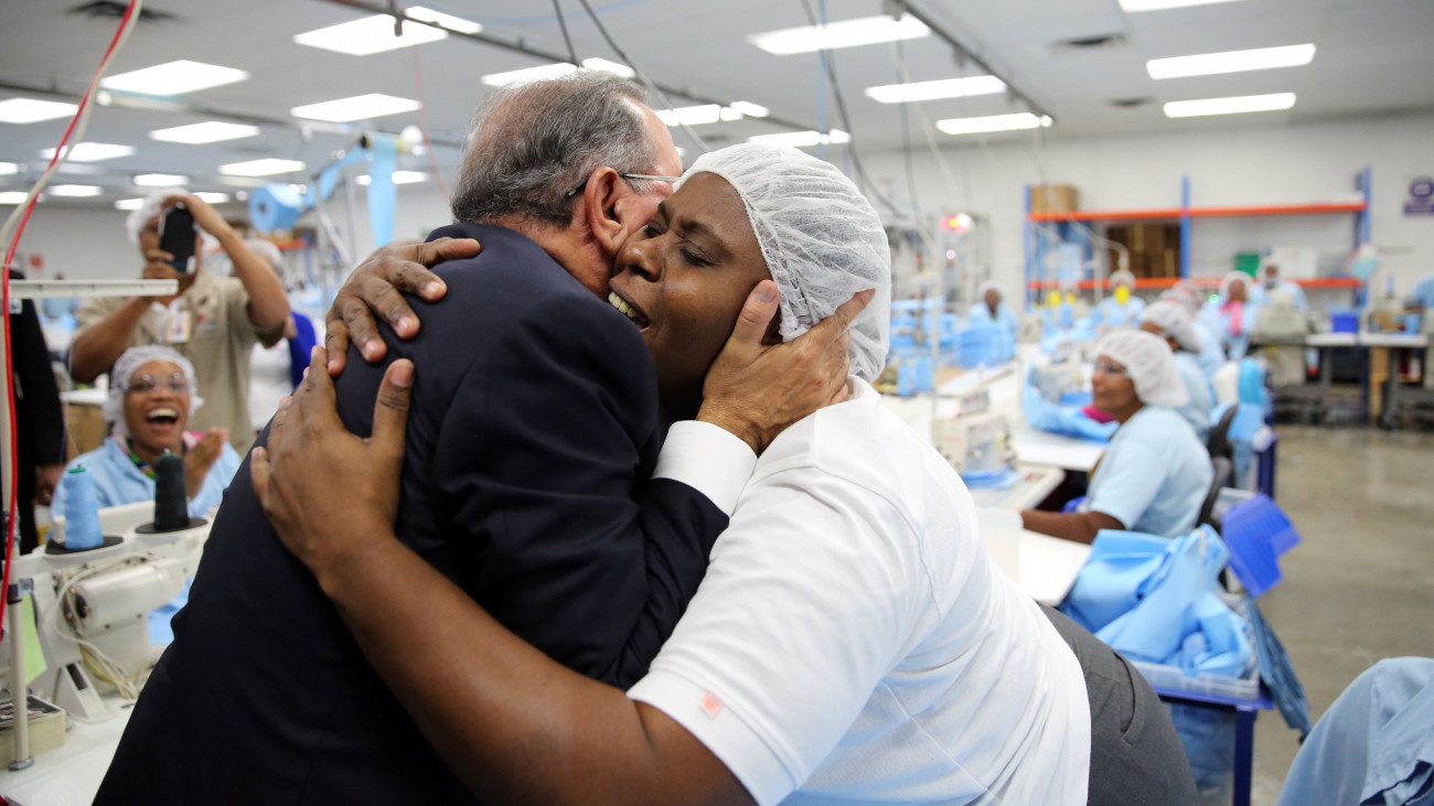 Presidente Danilo Medina junto a empleados de la empresa Fenwal International Inc, en Zona Franca de San Cristóbal durante recorrido previo a recepción inaugural.