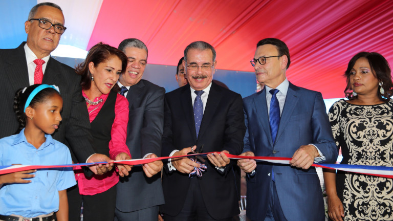 Presidente de la República, Danilo Medina Sánchez corta la cinta para dejar inaugurados los nuevos centros educativos. Le acompañan el ministro de Educación, Carlos Amarante Baret; Johanny Ramírez, esudiante; Dominga Simé, directora de la Escuela Juan Pablo Duarte y Miguel Pimentel, director de la Oficina Supervisora de Obras del Estado, entre otros