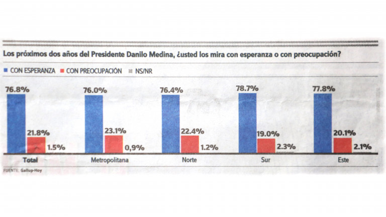 Facsímil de gráfica visual sobre resultados de la Encuesta Gallup-Hoy: 76.8% mira con ESPERANZA los próximos 2 años de gobierno de Danilo Medina.