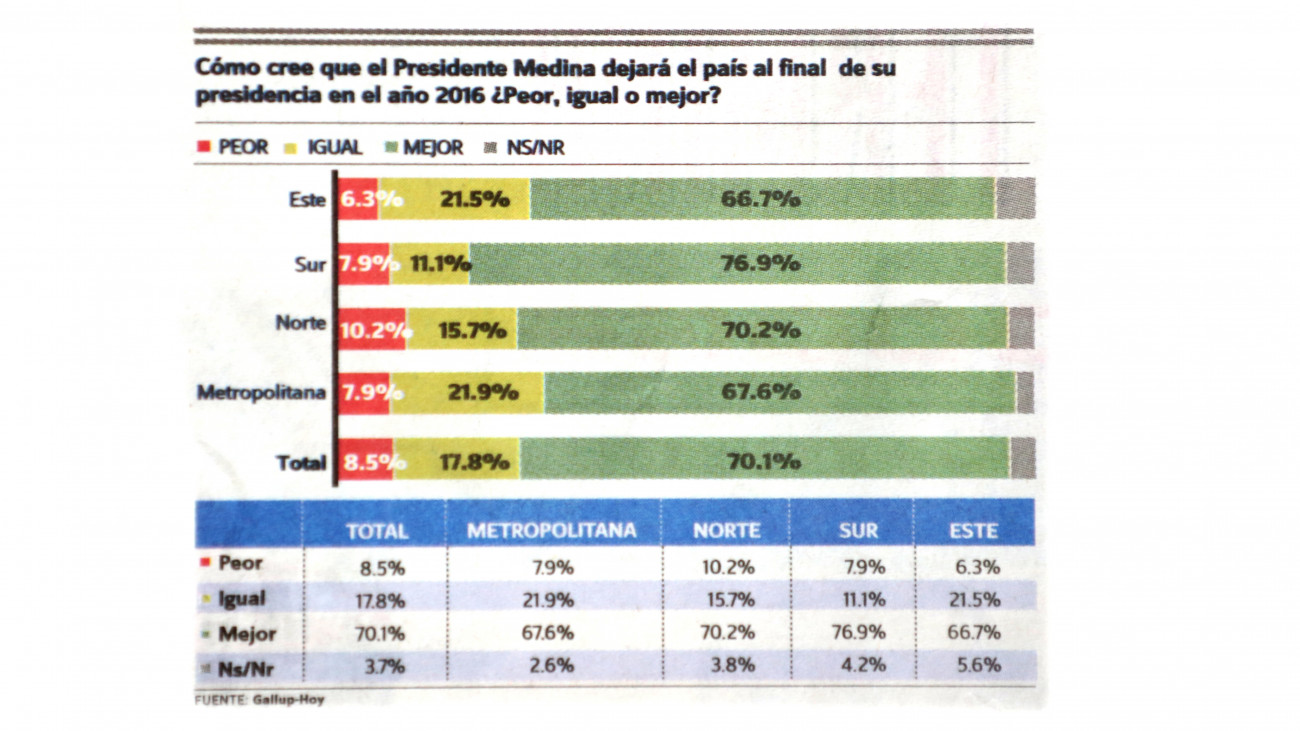 Facsímil de gráfica visual sobre resultados de la Encuesta Gallup-Hoy: 70.1% cree Danilo Medina dejará un PAÍS MEJOR.
