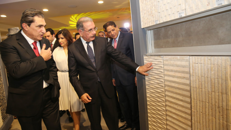 Presidente de la República, Danilo Medina Sánchez, vicepresidenta Cedeño de Fernández y Ricardo Subero Isa, presidente de DCM, durante recorrido por la moderna edificación de cinco niveles, en la cual se exhibe lo último en tecnología para la construcción.