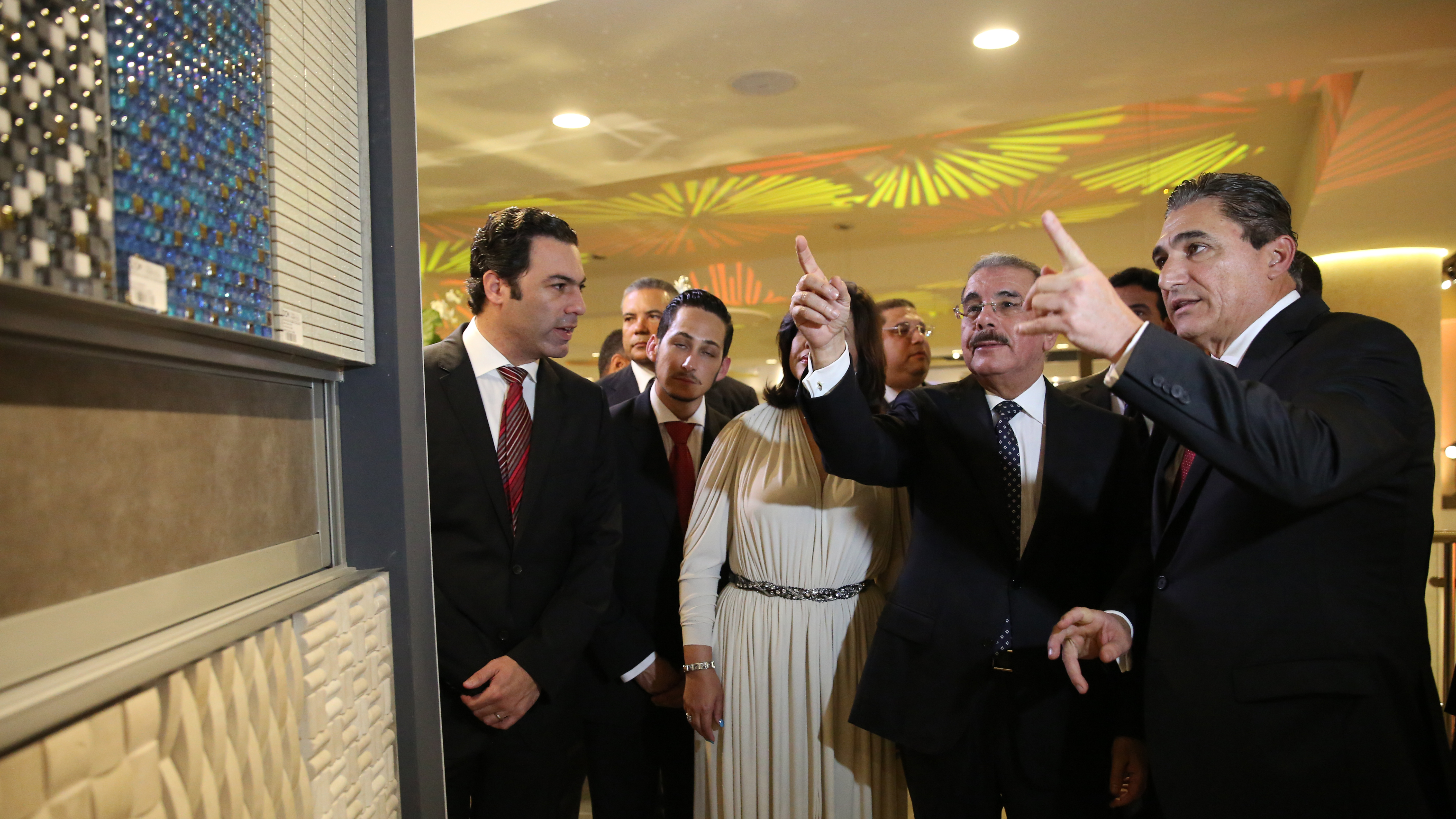 Presidente de la República, Danilo Medina Sánchez, vicepresidenta Cedeño de Fernández y Ricardo Subero Isa, presidente de DCM, durante recorrido por la moderna edificación de cinco niveles, en la cual se exhibe lo último en tecnología para la construcción.