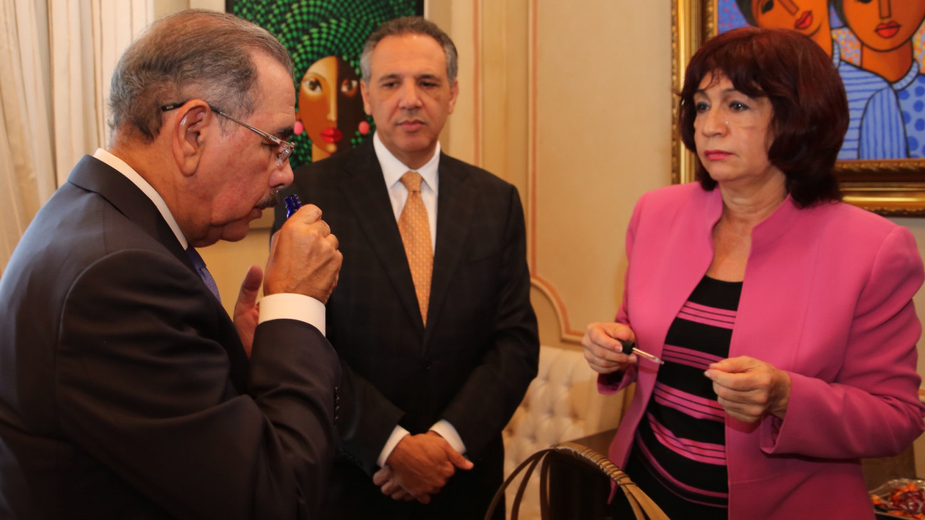 La directora ejecutiva del Instituto de Innovación en Biotecnología e Industria (IIBI), Bernarda Castillo, mientras muestra al presidente Danilo Medina y al ministro Peralta algunos de los productos elaborados por las asociaciones.